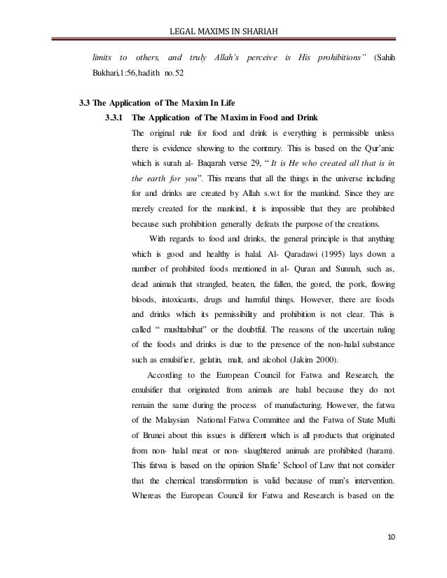 - 10. LEGAL MAXIMS IN SHARIAH 10 limits to others, and truly Allah’s perceive is His prohibitions” (Sahih Bukhari,1:56,hadith no.52 3.3 The Application of The Maxim In Life 3.3.1 The Application of The Maxim in Food and Drink The original rule for food and drink is everything is permissible unless there is evidence showing to the contrary. This is based on the Qur’anic which is surah al- Baqarah verse 29, “ It is He who created all that is in the earth for you”. This means that all the things in the universe including for and drinks are created by Allah s.w.t for the mankind. Since they are merely created for the mankind, it is impossible that they are prohibited because such prohibition generally defeats the purpose of the creations. With regards to food and drinks, the general principle is that anything which is good and healthy is halal. Al- Qaradawi (1995) lays down a number of prohibited foods mentioned in al- Quran and Sunnah, such as, dead animals that strangled, beaten, the fallen, the gored, the pork, flowing bloods, intoxicants, drugs and harmful things. However, there are foods and drinks which its permissibility and prohibition is not clear. This is called “ mushtabihat” or the doubtful. The reasons of the uncertain ruling of the foods and drinks is due to the presence of the non-halal substance such as emulsifier, gelatin, malt, and alcohol (Jakim 2000). According to the European Council for Fatwa and Research, the emulsifier that originated from animals are halal because they do not remain the same during the process of manufacturing. However, the fatwa of the Malaysian National Fatwa Committee and the Fatwa of State Mufti of Brunei about this issues is different which is all products that originated from non- halal meat or non- slaughtered animals are prohibited (haram). This fatwa is based on the opinion Shafie’ School of Law that not consider that the chemical transformation is valid because of man’s intervention. Whereas the European Council for Fatwa and Research is based on the