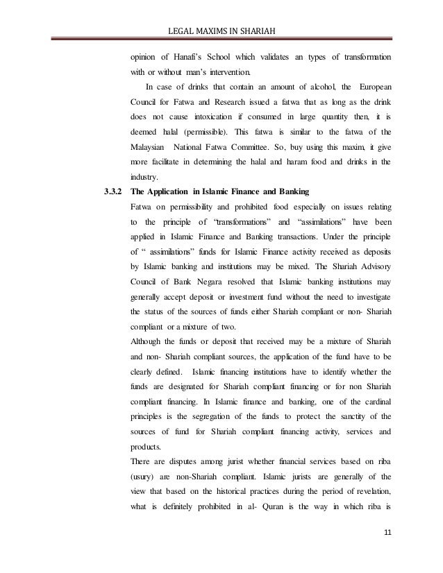 - 11. LEGAL MAXIMS IN SHARIAH 11 opinion of Hanafi’s School which validates an types of transformation with or without man’s intervention. In case of drinks that contain an amount of alcohol, the European Council for Fatwa and Research issued a fatwa that as long as the drink does not cause intoxication if consumed in large quantity then, it is deemed halal (permissible). This fatwa is similar to the fatwa of the Malaysian National Fatwa Committee. So, buy using this maxim, it give more facilitate in determining the halal and haram food and drinks in the industry. 3.3.2 The Application in Islamic Finance and Banking Fatwa on permissibility and prohibited food especially on issues relating to the principle of “transformations” and “assimilations” have been applied in Islamic Finance and Banking transactions. Under the principle of “ assimilations” funds for Islamic Finance activity received as deposits by Islamic banking and institutions may be mixed. The Shariah Advisory Council of Bank Negara resolved that Islamic banking institutions may generally accept deposit or investment fund without the need to investigate the status of the sources of funds either Shariah compliant or non- Shariah compliant or a mixture of two. Although the funds or deposit that received may be a mixture of Shariah and non- Shariah compliant sources, the application of the fund have to be clearly defined. Islamic financing institutions have to identify whether the funds are designated for Shariah compliant financing or for non Shariah compliant financing. In Islamic finance and banking, one of the cardinal principles is the segregation of the funds to protect the sanctity of the sources of fund for Shariah compliant financing activity, services and products. There are disputes among jurist whether financial services based on riba (usury) are non-Shariah compliant. Islamic jurists are generally of the view that based on the historical practices during the period of revelation, what is definitely prohibited in al- Quran is the way in which riba is