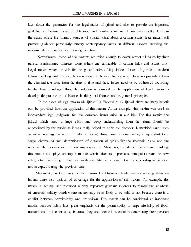 - 13. LEGAL MAXIMS IN SHARIAH 13 lays down the parameter for the legal status of ijtihad and also to provide the important guideline for human beings to determine and resolve situation of uncertain validity. Thus, in the cases where the primary sources of Shariah silent about a certain issues, legal maxim will provide guidance particularly inmany contemporary issues in different aspects including the modern Islamic finance and banking practice. Nevertheless, some of the maxims are wide enough to cover almost all issues by their general applications, whereas some others are applicable in certain fields and issues only. Legal maxim which provide for the general rules of fiqh indeed, have a big role in modern Islamic banking and finance. Modern issues in Islamic finance which have no precedent from the classical text arise from the time to time and these issues need to be addressed according to the Islamic rulings. Thus, the solution is founded in the application of legal maxim to develop the parameters of Islamic banking and finance and its general principles. In the cases of legal maxim al- Ijtihad La Yanqud bi al- Ijtihad, there are many benefit can be provided from the application of this maxim. As an example, this maxim was used as independent legal judgment for the common issues arise in our life. For this maxim the ijtihad which need a huge effort and deep understanding from the ulama should be appreciated by the public as it was really helped to solve the disorders humankind issues such as either uterring the word of talaq (divorce) three times in one setting is equivalent to a single divorce or not, determination of direction of qiblah for the uncertain place and the issue of the permissibility of smoking cigarettes. Moreover, in Islamic finance and banking, this maxim also plays an important role which taken as a precious principal to issue the new ruling after the arising of the new evidences later as to deem the previous ruling to be valid and accepted during the previous time. Meanwhile, in the cases of the maxim Iza Ijtama’a al-halal wa al-haram ghalaba al- haram, there also various of advantage for the application of this maxim. For example, this maxim is actually had provided a very important guideline in order to resolve the situations of uncertain validity which where an act may be as likely to be valid as not because there is a conflict between permissibility and prohibition. This maxim can be considered as important maxim because Islam lays great emphasis on the permissibility or impermissibility of food, transactions, and other acts, because they are deemed essential in determining their position