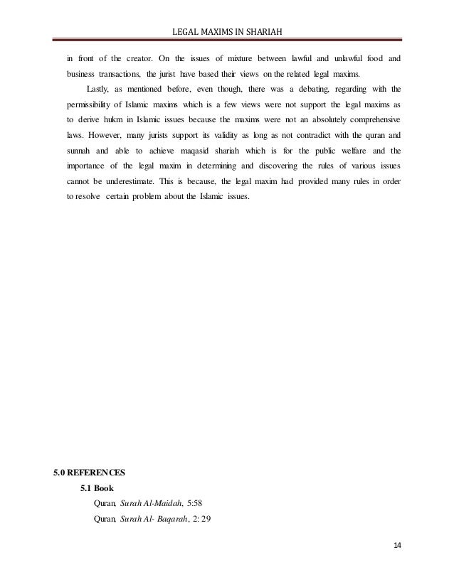 - 14. LEGAL MAXIMS IN SHARIAH 14 in front of the creator. On the issues of mixture between lawful and unlawful food and business transactions, the jurist have based their views on the related legal maxims. Lastly, as mentioned before, even though, there was a debating, regarding with the permissibility of Islamic maxims which is a few views were not support the legal maxims as to derive hukm in Islamic issues because the maxims were not an absolutely comprehensive laws. However, many jurists support its validity as long as not contradict with the quran and sunnah and able to achieve maqasid shariah which is for the public welfare and the importance of the legal maxim in determining and discovering the rules of various issues cannot be underestimate. This is because, the legal maxim had provided many rules in order to resolve certain problem about the Islamic issues. 5.0 REFERENCES 5.1 Book Quran, Surah Al-Maidah, 5:58 Quran, Surah Al- Baqarah, 2: 29