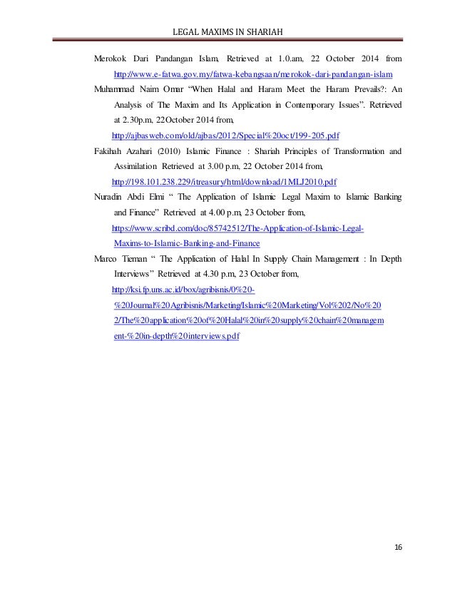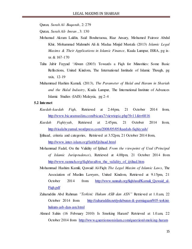 - 15. LEGAL MAXIMS IN SHARIAH 15 Quran, Surah Al- Baqarah, 2: 279 Quran, Surah Ali- Imran , 3: 130 Mohamad Akram Laldin, Said Bouheraoua, Riaz Ansary, Mohamed Fairooz Abdul Khir, Mohammad Mahmubi Ali & Madaa Minjid Mustafa (2013) Islamic Legal Maxims & Their Applications in Islamic Finance, Kuala Lumpur, ISRA, pg ix- xx & 167-170 Taha Jabir Fayyad ‘Alwan (2003) Towards a Fiqh for Minorities: Some Basic Reflections, United Kindom, The International Institude of Islamic Though, pg xxix, 12-19 Muhammad Hashim Kamali, (2013), The Parameter of Halal and Haram in Shariah and the Halal Industry, Kuala Lumpur, The International Institute of Advances Islamic Studies (IAIS) Malaysia, pg 2-4 5.2 Internet Kaedah-kaedah Fiqh, Retrieved at 2.44pm, 21 October 2014 from, http://www.bicaramuslim.com/bicara7/viewtopic.php?f=11&t=6816 Kaedah Fiqhiyyah, Retrieved at 2.45pm, 21 October 2014 from, http://risalahsyumul.wordpress.com/2008/05/05/kaedah-fiqhiyyah/ Ijtihaad, criteria and categories, Retrieved at 3.52pm, 21 October 2014 from, http://www.inter-islam.org/faith/Ijtihaad.html Mohammad Fadel, On the Validity of Ijtihad: From the viewpoint of Usul (Principal of Islamic Jurisprudence), Retrieved at 4.00pm, 21 October 2014 from http://www.sunnah.org/fiqh/usul/on_the_validity_of_ijtihad.htm Mohammad Hashim Kamili, Qawaid Al-Fiqh: The Legal Maxim of Islamic Laws, The Association of Muslim Lawyers, United Kindom, Retrieved at 9.15pm, 21 October 2014 from http://www.sunnah.org/fiqh/usul/Kamali_Qawaid_al- Fiqh.pdf Zaharuddin Abd Rahman “Terkini: Hukum ASB dan ASN” Retrieved at 1.0.am, 22 October 2014 from http://zaharuddin.net/pelaburan-&-perniagaan/805-terkini- hukum-asb-dan-asn.html Ahmed Sahin (16 February 2010) Is Smoking Haram? Retrieved at 1.0.am, 22 October 2014 from http://www.questionsonislam.com/question/smoking-haram