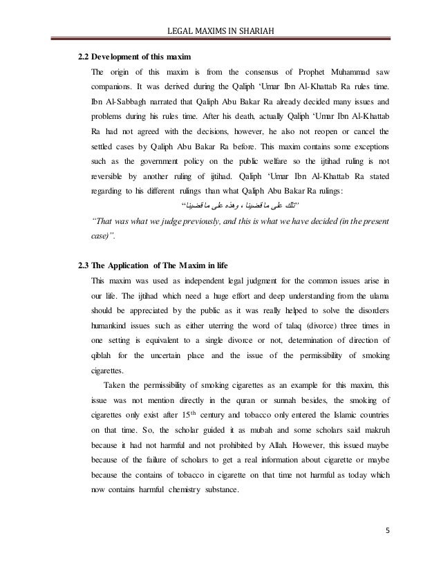 - 5. LEGAL MAXIMS IN SHARIAH 5 2.2 Development of this maxim The origin of this maxim is from the consensus of Prophet Muhammad saw companions. It was derived during the Qaliph ‘Umar Ibn Al-Khattab Ra rules time. Ibn Al-Sabbagh narrated that Qaliph Abu Bakar Ra already decided many issues and problems during his rules time. After his death, actually Qaliph ‘Umar Ibn Al-Khattab Ra had not agreed with the decisions, however, he also not reopen or cancel the settled cases by Qaliph Abu Bakar Ra before. This maxim contains some exceptions such as the government policy on the public welfare so the ijtihad ruling is not reversible by another ruling of ijtihad. Qaliph ‘Umar Ibn Al-Khattab Ra stated regarding to his different rulings than what Qaliph Abu Bakar Ra rulings: “ قضينا ما على تلك،قضينا ما على وهذه ” “That was what we judge previously, and this is what we have decided (in the present case)”. 2.3 The Application of The Maxim in life This maxim was used as independent legal judgment for the common issues arise in our life. The ijtihad which need a huge effort and deep understanding from the ulama should be appreciated by the public as it was really helped to solve the disorders humankind issues such as either uterring the word of talaq (divorce) three times in one setting is equivalent to a single divorce or not, determination of direction of qiblah for the uncertain place and the issue of the permissibility of smoking cigarettes. Taken the permissibility of smoking cigarettes as an example for this maxim, this issue was not mention directly in the quran or sunnah besides, the smoking of cigarettes only exist after 15th century and tobacco only entered the Islamic countries on that time. So, the scholar guided it as mubah and some scholars said makruh because it had not harmful and not prohibited by Allah. However, this issued maybe because of the failure of scholars to get a real information about cigarette or maybe because the contains of tobacco in cigarette on that time not harmful as today which now contains harmful chemistry substance.