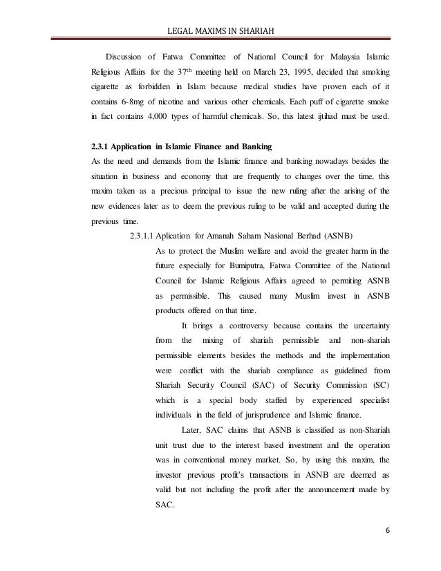 - 6. LEGAL MAXIMS IN SHARIAH 6 Discussion of Fatwa Committee of National Council for Malaysia Islamic Religious Affairs for the 37th meeting held on March 23, 1995, decided that smoking cigarette as forbidden in Islam because medical studies have proven each of it contains 6-8mg of nicotine and various other chemicals. Each puff of cigarette smoke in fact contains 4,000 types of harmful chemicals. So, this latest ijtihad must be used. 2.3.1 Application in Islamic Finance and Banking As the need and demands from the Islamic finance and banking nowadays besides the situation in business and economy that are frequently to changes over the time, this maxim taken as a precious principal to issue the new ruling after the arising of the new evidences later as to deem the previous ruling to be valid and accepted during the previous time. 2.3.1.1 Aplication for Amanah Saham Nasional Berhad (ASNB) As to protect the Muslim welfare and avoid the greater harm in the future especially for Bumiputra, Fatwa Committee of the National Council for Islamic Religious Affairs agreed to permiting ASNB as permissible. This caused many Muslim invest in ASNB products offered on that time. It brings a controversy because contains the uncertainty from the mixing of shariah permissible and non-shariah permissible elements besides the methods and the implementation were conflict with the shariah compliance as guidelined from Shariah Security Council (SAC) of Security Commission (SC) which is a special body staffed by experienced specialist individuals in the field of jurisprudence and Islamic finance. Later, SAC claims that ASNB is classified as non-Shariah unit trust due to the interest based investment and the operation was in conventional money market. So, by using this maxim, the investor previous profit’s transactions in ASNB are deemed as valid but not including the profit after the announcement made by SAC.