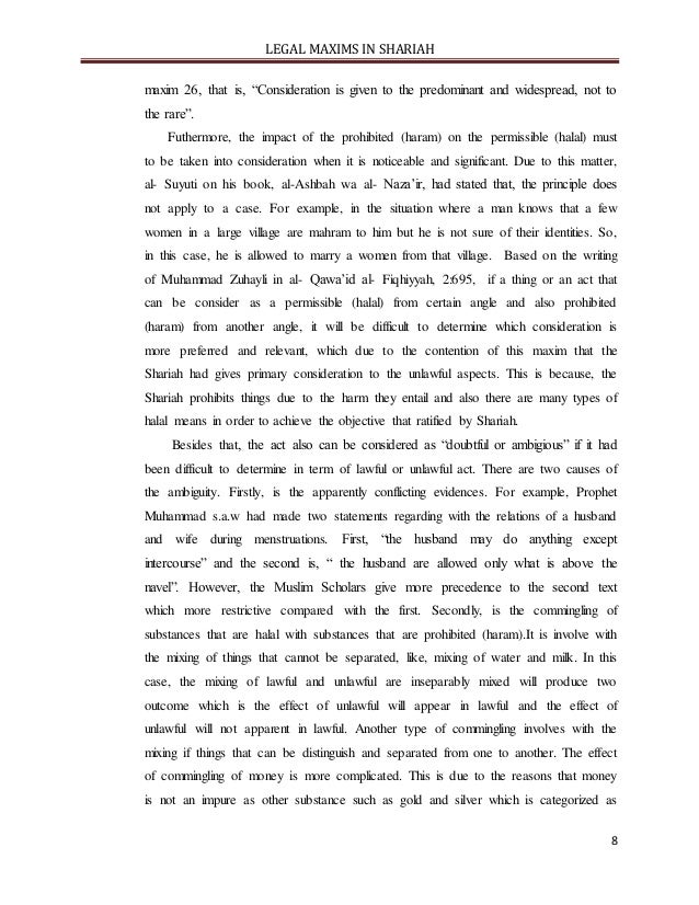 - 7. LEGAL MAXIMS IN SHARIAH 7 3.0 Iza Ijtama’a Al-Halal Wa Al- Haram Ghalaba Al- Haram 3.1 Definition and explanation Generally, this maxim mean “ if permissibility and prohibition coincide, prohibition prevails”. In more detail, this maxims relate with the concept of halal and haram. Actually, halal is anything that has permitted by Allah s.w.t, while, haram can be defines as anything that has been prohibited by Allah s.w.t. and these both category have originally applied to an act. Halal also may be defined as an act or object or conduct which the individual has freedom of choice and its exercise does not carry out either reward or punishments. Halal encompasses obligatory, recommended, neutral or permissible or also dislike. Moreover, things also can be permissible (halal) or prohibited (haram) in consideration of the act associated with them. The Shafie’ jurist interpretation regarding this maxim is that refer to the mubah (neutral or permissible). Meanwhile for Hanafi jurist, state that the halal matters here is encompasses the wajib (obligatory) as well. Muslim Jurist have discussed about the sources of evidence on halal and haram and formulated guidelines to regulate their application to slaughter procedures. On top of that, regarding with the importance of this maxim, it is actually had provided a very important guideline in order to resolve the situations of uncertain validity which where an act may be as likely to be valid as not because there is a conflict between permissibility and prohibition. However, if when applied to Islamic finance and banking, an important distinction must be borne in kind between things that prohibited (haram) and permissible (halal). This is because, its essence and earnings that are tainted by the way they were earned. For example, in the contract of bay al- dayn and also bay al-inah. On the other hand, another key term in this maxim is ijtama’a which is the reflexive form of the verb ijtama’a jama’a/yajma’u that means “to gather, combine, unify and also collect”. Meanwhile, for the ijtama’a a/yajtamani’u can be defined as “ to gather together, to combine with and also to meet which has more broad meaning compare to ijtama’a/yajma’u. For this maxim, its meaning should be understood in